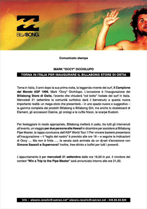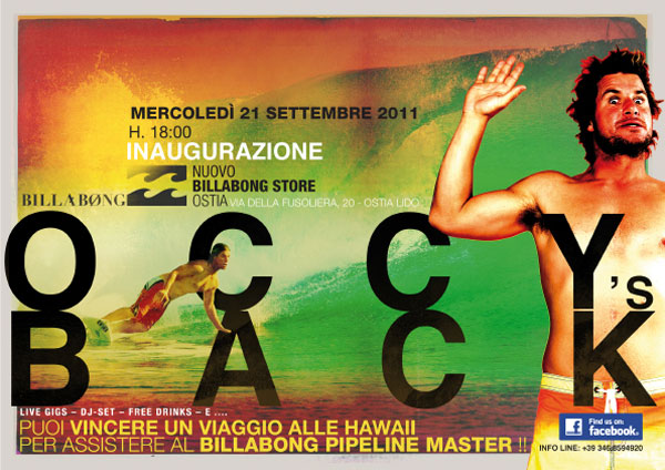 Mercoledì 21 settembre inaugura ad Ostia il primo Billabong Store. A tagliare il nastro ci sarà Mark “Occy” Occhilupo e verrà messo in palio tra i presenti un viaggio per due persone al Pipeline Masters di dicembre.