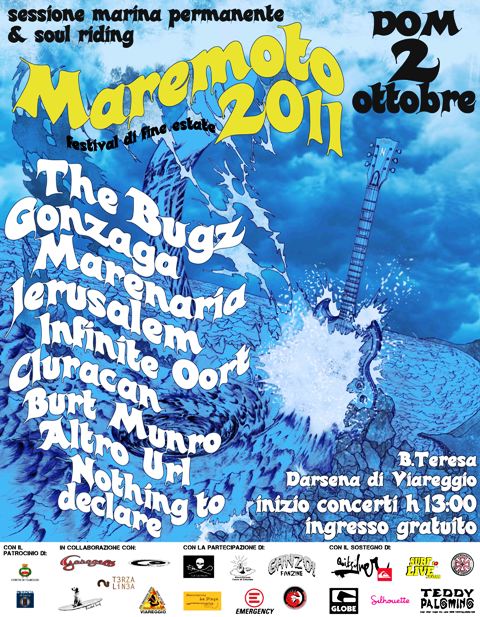 Musica. Al Festival prenderanno parte 8 band di musica indipendente e originale. Al Maremoto non si possono suonare cover. Dalla scena rock pisana arrivano i The Bugz mentre un grande spazio è riservato alla scena locale con i Marenaria, Jerusalem, Cluracan, Burt Munro, Altro Url e Nothing To Declare. Si spazierà dal rock all’indieall’hard rock alla psichedelica. Headliner del Festival la band vincitrice del Summer Giovani 2011 i Gonzaga! Chiuderanno questa edizione con il loro sound potente e ricercato. Con questa scelta gli organizzatori del Festival hanno voluto creare una sorta di circuito musicale provinciale che lega il Festival di Fine Estate Maremoto ad una grande realtà musicale nazionale come il Summer Giovani. Uno degli obbiettivi del Festival di Fine Estate Maremoto 2011 sarà la promozione della struttura provinciale Cantiere Giovani e delle opportunità musicali che questa struttura permette!