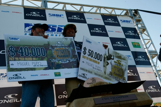 E’ il brasiliano Miguel Pupo, al termine di un air show messo in atto il giorno della finale, a vincere l’O’Neill Cold Water Classic in Santa Cruz, California, intascando un assegno da 90.000 dollari.