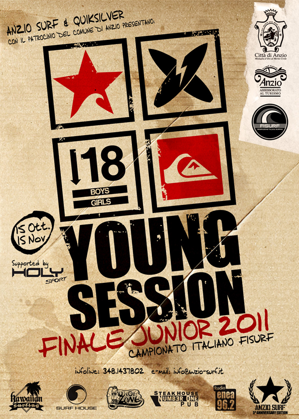 Torna ad Anzio il futuro del surf italiano. Nel periodo previsto tra il 15 ottobre e il 15 novembre 2011 Anzio Surf in collaborazione con Quiksilver e Fisurf presentano YOUNG SESSION finalissima del campionato italiano Fisurf per le categorie Under 14, Under 16 e Under 18 maschile e femminile.