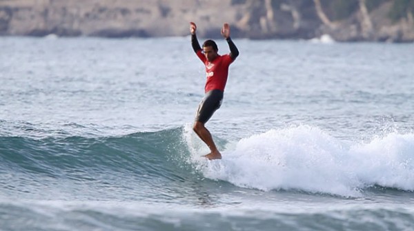 Kai Sallas in uno degli innumerevoli hang ten sfoggiati durante la gara
