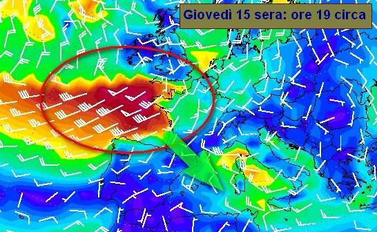 Sarà questo ciclone a pilotare la terza perturbazione della settimana (la prima ieri, la seconda mercoledì e la terza venerdì) verso l’Italia, e i suoi venti, seppur attenuati, interesseranno anche il Mediterraneo occidentale. Dalle immagini dei venti previsti dal modello GFS potete farvi un’idea dei venti che interesseranno Francia occidentale prima, e Mediterraneo poi.