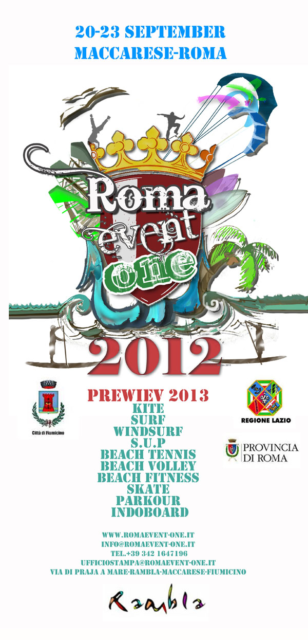 Dopo l’enorme successo del 2011, che ha visto sfilare fra musica, colori, sport e divertimento, i migliori atleti del mare su tavole, con vele, aquiloni e pagaie, anche il 2012 vede arrivare il “ROMA EVENT ONE 2.0”, che vedrà Roma riaffermarsi per il secondo anno di seguito come capitale degli sport acquatici e on the beach.