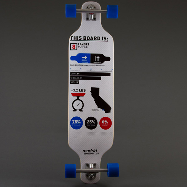 La collezione 2012 di Madrid si compone di oltre 40 modelli con Longboard specifici da downhill, freeride, cruising e carving, Midget ed alcune tavole da street e pool realizzate con tecnologie innovative.