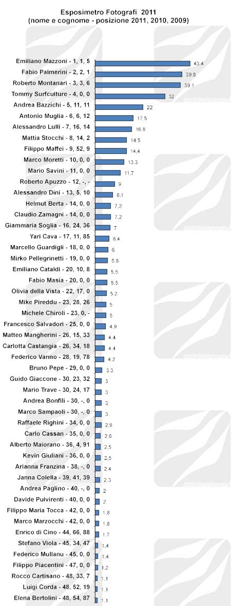 Pronto anche quest’anno il Surf Esposimetro che stila la classifica dei rider italiani più visti, dei fotografi più attivi e delle riviste più italiane della scena nazionale nel corso dell’anno passato, in questo caso il 2011.