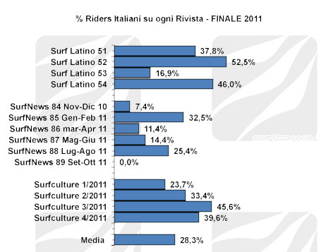 L’Esposimetro Surf 2011 ha preso a campione tutte le principali riviste di surf italiane uscite nell’arco del 2011 e reperite dalla redazione: Surf Latino (51, 52, 53, 54), Surf News (84, 85, 86, 87, 88), Surfculture (1, 2, 3, 4).