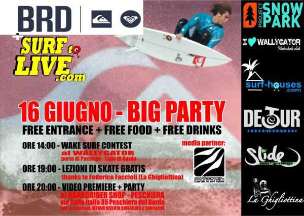 SURFtoLIVE é lieta di invitarvi Sabato 16 Giugno ad una grande festa che terrá presso il BOARDRIDER STORE (Quiksilver shop ex DETOUR) a Peschiera del Garda (info su facebook SURFtoLIVE) per la PREMIERE del nuovo video di Alessandro Piu, Campione Italiano di SURF e atleta del team.