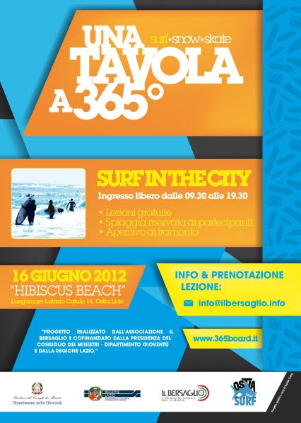 Il prossimo sabato 16 giugno 2012, presso l’ “Hibiscus beach” (Lungomare Lutazio Catulo, 14 – Ostia Lido) si svolgerà “Surf in the city”, l’ evento conclusivo del progetto “Una tavola a 365°”.