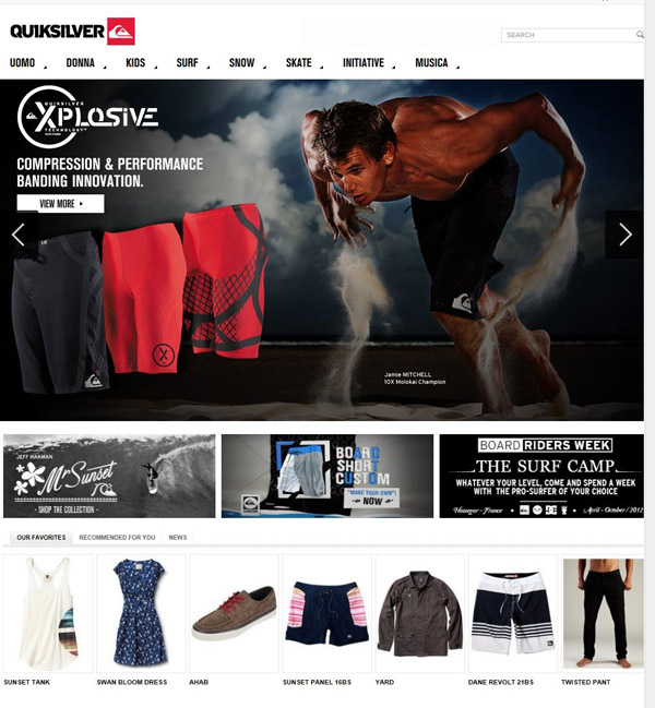 Grazie all’utilizzo di una delle piattaforme maggiormente evolute, il nuovo Quiksilver.com offre agli internauti un ambiente interattivo ricco di contenuti, ma facilmente fruibile, all’interno del quale è possibile visualizzare gli oltre 3000 prodotti delle collezioni Quiksilver.
