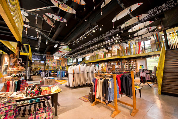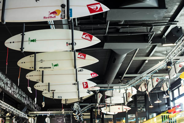 La gamma di tavole da surf è da folli; sono disponibili non meno di 200 modelli. Altri modelli speciali scorrono sul soffitto agganciante ad un nastro trasportatore … sono tutte appartenute a surfisti del team Pro e sono anch’esse in vendita! Le schede tecniche di ogni singola tavola possono essere consultate attraverso un sistema digitale incorporato ad un vecchio tavolo per geometri e collegato al nastro trasportatore.