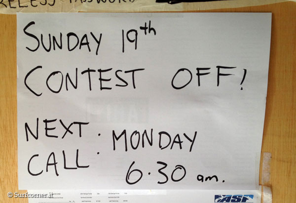 Un leggero impulso era atteso per la serata e si spera in un ulteriore aumento per oggi per poter ripartire col terzo round. Un aumento più significativo della swell è atteso in realtà solo verso la fine del waiting period, il prossimo 27 agosto, ma Dave Prodan, Media Manager ASP International, confida nella possibilità dello svolgimento della competizione :”La cosa importante non è se si svolgerà o meno la gara, ma con quali condizioni si potrà farlo”.