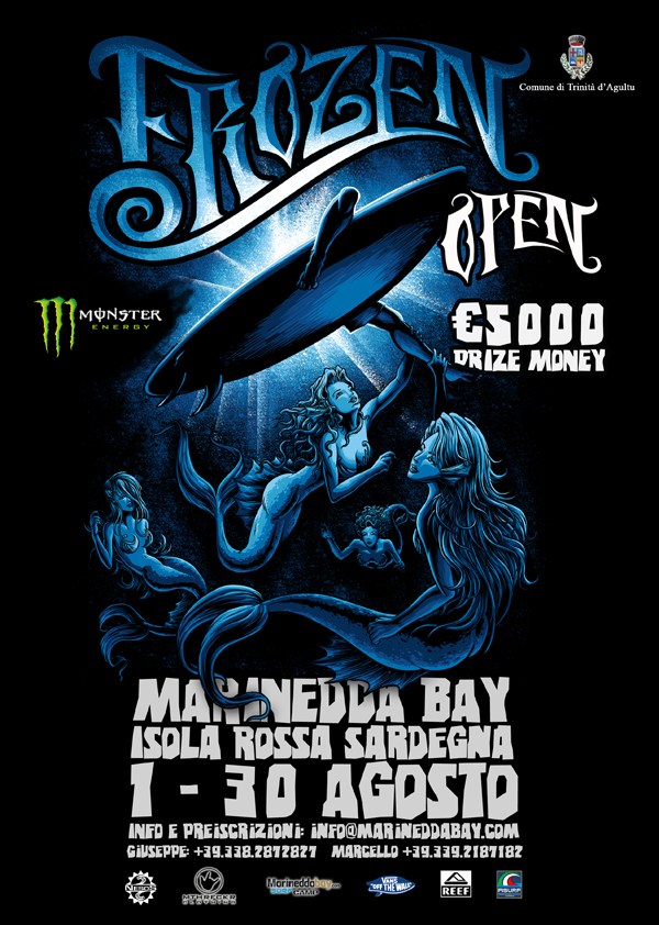 Il Frozen Open è presentato da Monster Energy e ha lo sponsor di Frozen Clothing, Nesos, Motherfucker, Vans, Reef e Marinedda Bay surf camp. Ha il patrocinio della federazione di surf da onda Fisurf e del Comune di Trinità d’Agultu. L’organizzazione è affidata al Nesos surf Club di Giuseppe Romano, Marcello Chessa e Fabio Di Molfetta. Il sito ufficiale della manifestazione, con tutte le gallery fotografiche dei contest precedenti e gli aggiornamenti è www.marineddabay.com, per gli appassionati dei social network c’è il profilo facebook Frozen Open.