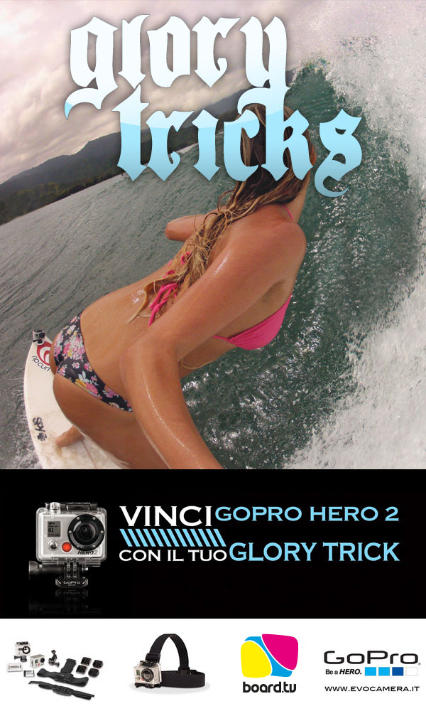 Vuoi vincere una GoPro Hero2 e tanti accessori firmati GoPro? Sottoscrivi il tuo video di surf o skate della lunghezza massima di 4 minuti, contenente le tue migliori immagini action filmate durante l’estate e giocati il tutto per tutto nel concorso di fine stagione “GoPro Glory Tricks”.