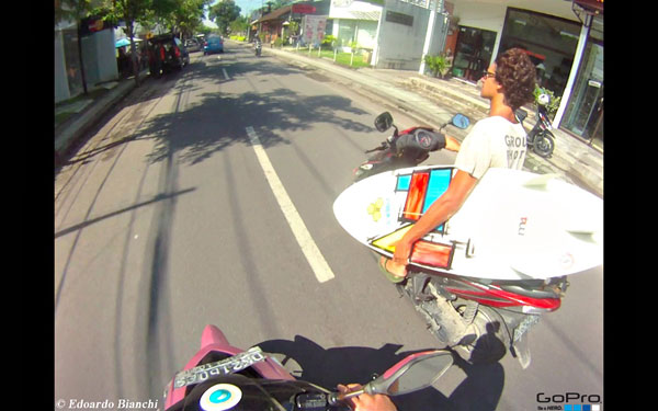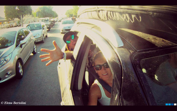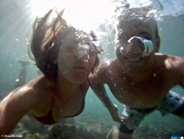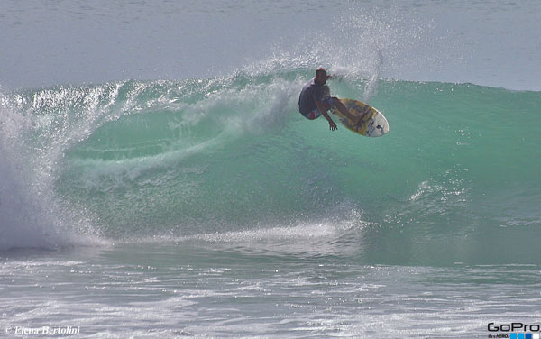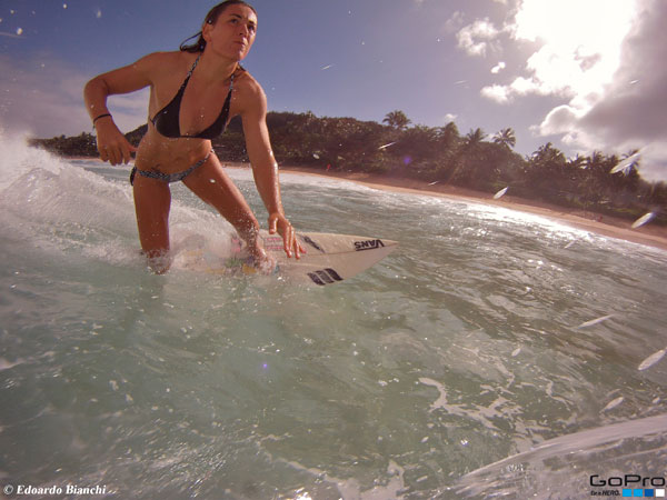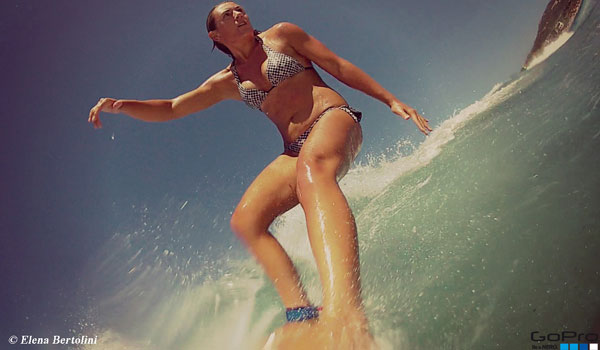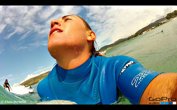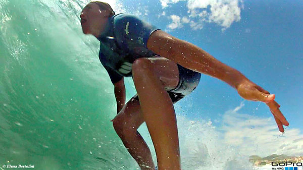 Elena. Ho iniziato a usare la GoPro un anno fa a Bali perché Edoardo si era portato con se la GoPro HD Hero che gli avevo regalato per la sua laurea. Le prime volte la usavo soprattutto per fare foto e video in giro per Bali. In seguito ho capito che poteva essere un valido aiuto per il mio surf ed ho incominciato a usarla anche durante le mie surfate, grazie al supporto per la tavola che mi aveva regalato Edoardo.