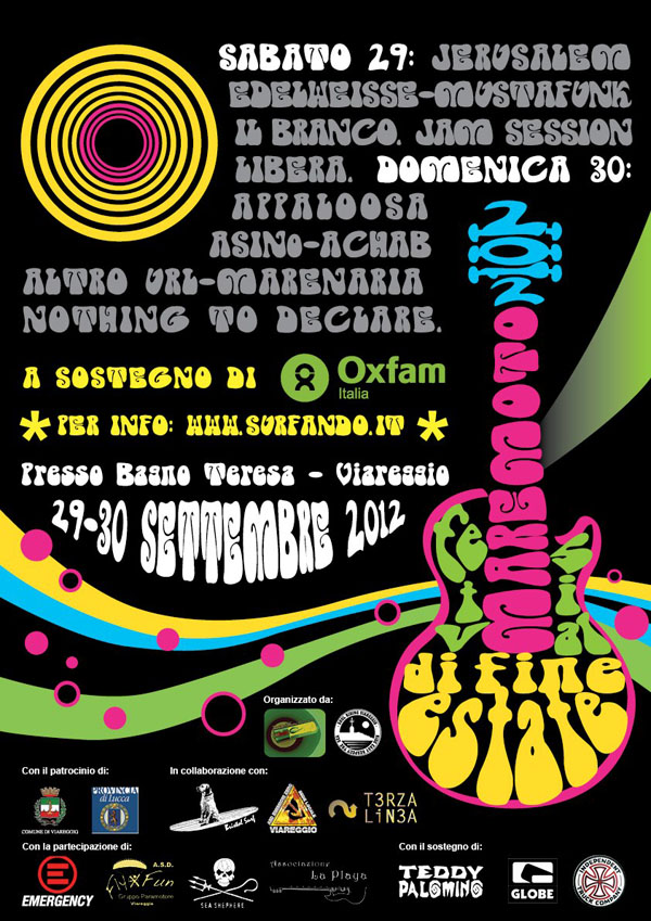 Sabato 29 e domenica 30 settembre torna il Festival di Fine Estate Maremoto, ormai giunto alla V edizione, il Festival di musica, surf e solidarietà organizzato della associazioni Soul Riding Viareggio e Sessione Marina Permanente è divenuto un appuntamento da non perdere per i giovani appassionati di musica locali.