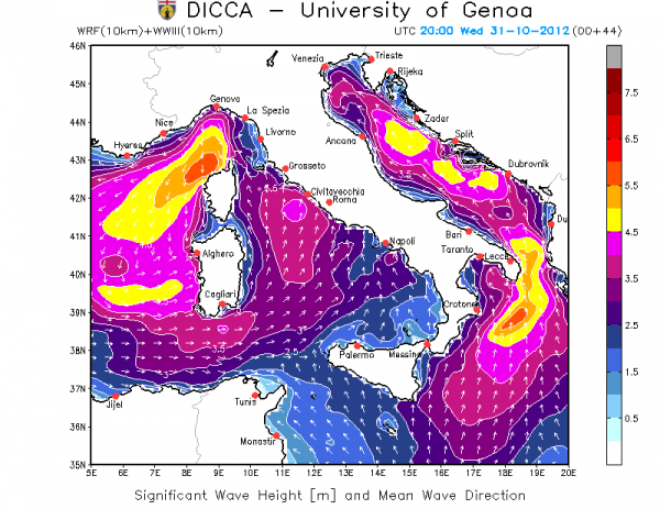 Ecco cosa ne pensa il modello DICCA (Uni – GE) per la serata di Halloween: mentre milioni di bambini staranno suonando nelle case, anche il Mediterraneo suonerà a modo suo: alle 21 momento di massimo caricamento della swell di scirocco su Adriatico e Jonio, e l’indomani vento debole off-shore sottocosta con un timido ma mite sole….