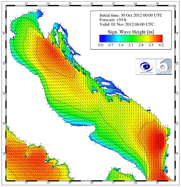Misura in calo: in Veneto da 1.5 m + al mattino fino a 0.8-1.2 m al pomeriggio, su alta Romagna fra 1.2-1.5 m al mattino fino a 0.8-1 m al pomeriggio, su bassa Romagna da 0.8-1.2 a 0.5-0.8 m, su nord Marche da 1-1.3 a 0.8 m circa, su sud Marche da 1.8-2 m a 1-1.3 m. Su Abruzzo Molise e nord Puglia da 1-1.3 m a 0.5-0.8 m, su sud Puglia da 1.2-1.5 m a 0.8-1 m.