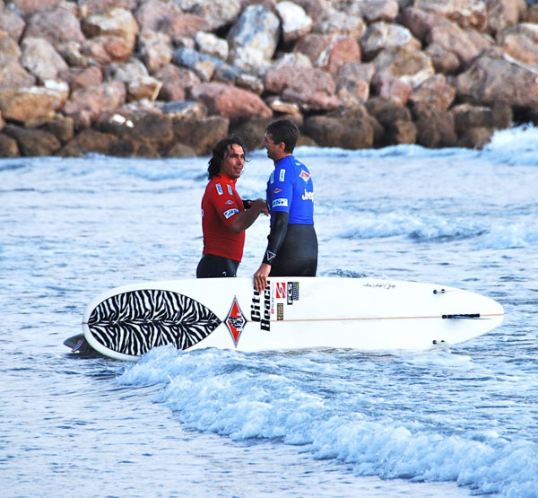La prima onda la prende Duane dove sfoggia subito un paio di manovre da punteggio, io successivamente ribatto con una buona onda destra che mi permette di fare due buoni hang 5 fin sotto nell’inside ma purtroppo le onde migliori e più grandi arrivavano sempre quando lui era in precedenza e quindi passa il turno come da pronostico ma, all’uscita dalla batteria vengo accolto da un calore ed una serie di complimenti da parte del pubblico presente e di alcuni atleti che non mi sarei mai aspettato.
