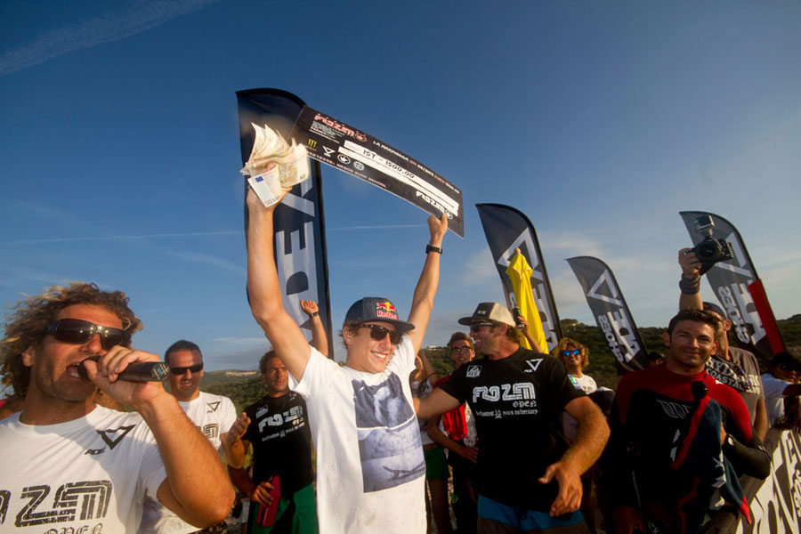 La premiazione, avvenuta intorno alle 19, è stata celebrata dal patron del marchio Frozen Fabio Di Molfetta, insieme a tutto il team Nesos al completo. Leonardo Fioravanti, come da tradizione, è stato innaffiato da una pioggia di energy drink Monster, sponsor principale della manifestazione, ed è stato sollevato di peso da Giuseppe Romano e Marcello Chessa davanti alla folla che lo applaudiva (decine gli autografi firmati dal nuovo campione del Frozen Open). Dopo qualche ora è iniziata la consueta festa nel quartier generale del Nesos surf club, al ritmo della musica dei dee-jay e delle onde che ancora rompevano potenti sulle secche della Marinedda.