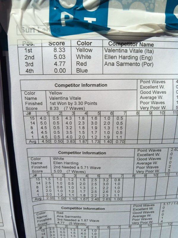 Valentina una volta piazzate due onde buone nel suo tabellino inizia a pressare la portoghese, mettendosi spesso in precedenza, buttandosi anche nei closeout pur di non lasciare alla portoghese onde buone, gli allenamenti durissimi a cui si è sottoposta questa estate pagano e Valentina è sempre più mobile delle concorrenti riuscendo sempre o a partire sull onda migliore o a bloccare la portoghese dal prendere le destre, lato in cui sappiamo essere devastante, del duello approfitta l’inglese che sorpresa del nostro tifo a favore si accaparra la seconda posizione.