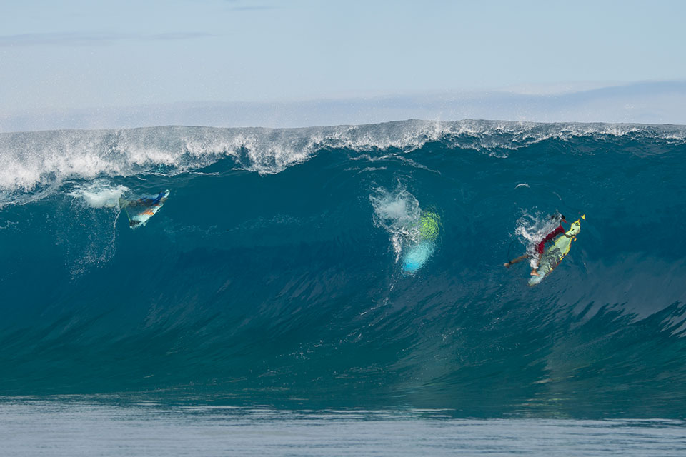 Onde magnifiche, ma che non perdonano errori, e insieme alla vittoria si è verificata anche una tragedia, vittima Kevin Bourez, fratello minore di Michel, che in seguito a un wipeout terrificante ha colpito il reef con la testa, rimediando diverse fratture e lacerazioni facciali, ed essendo sottoposto a operazione chirurgica per 4 ore. Le sue condizioni ora sono stabili. Kevin è risultato vincitore della sua heat ed uno dei favoriti ai trials.