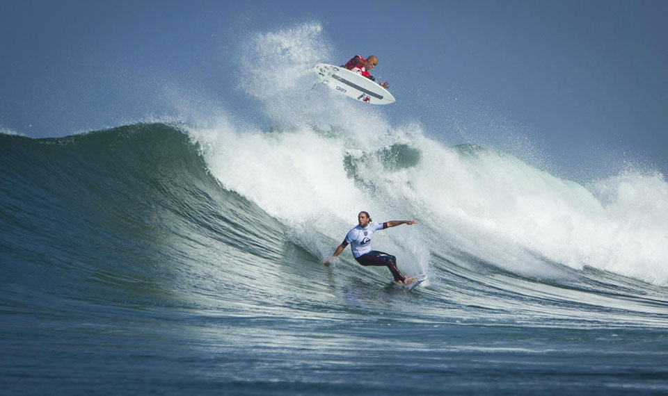 I primi due round del Quik Pro sono stati accesi dalle imprese di Slater, che a 42 anni continua a spingere sempre oltre i limiti del surf ad alti livelli. L’11 volte campione del mondo, nel primo round è stato protagonista di un’impresa mai vista finora nelle competizioni ASP, surfando la stessa onda di Matt Wilkinson e prendendo un punteggio senza fare interferenza. Totale: 17 punti su un’unica onda, tra lui e Wilko.