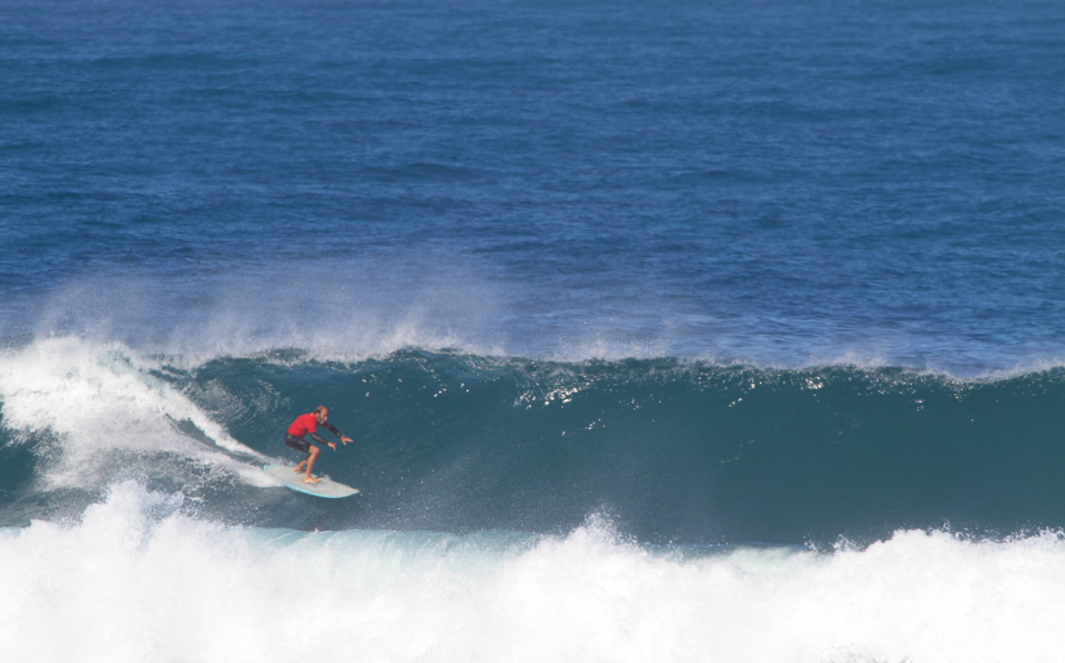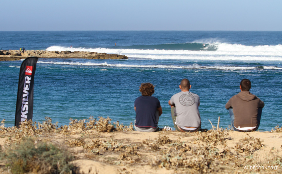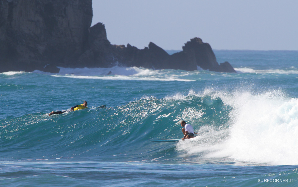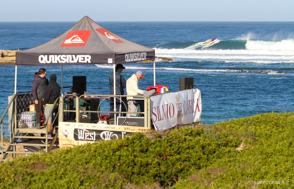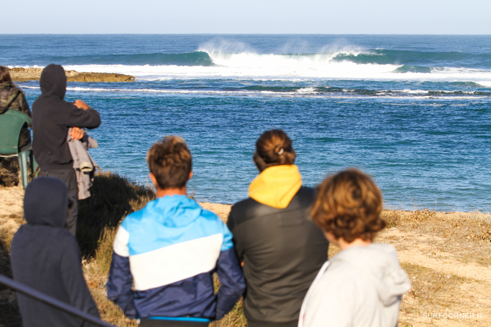 Pubblico e partecipanti sono stati accolti all’alba da una mega scaduta con set di onde consistenti e bava di vento da terra che manteneva ripide e pulite le onde. Il picco scelto per l’evento è stato quello centrale, che offriva una sinistra breve e intesa, e una destra lunghissima con sezioni tubanti, che srotolava fino a dietro l’isolotto che divide in due la baia.