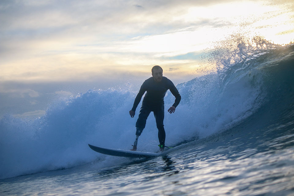 Ha dovuto aspettare molti anni tra la stabilizzazione dell’infortunio, le infezioni, le ricadute, scontrandosi con i tempi e la tecnologia di quindici anni fa, che non offriva una protesi adatta al surf. I primi tentativi di ritornare sulla line up li ha dovuti fare con una protesi costruita da solo ma che aveva ancora molti limiti, essendo costretto a fissarla alla gamba in modo artigianale, senza contare il fatto che il più delle volte la gamba gli volava via.
