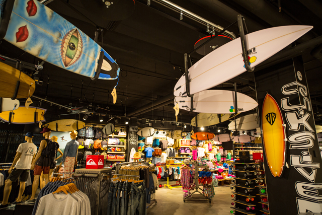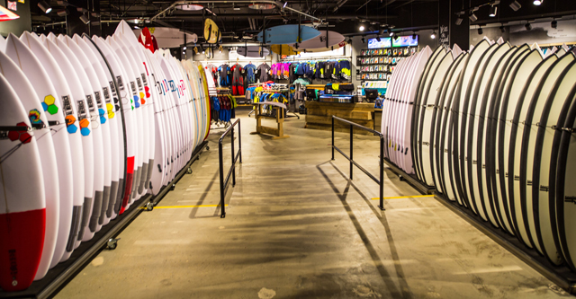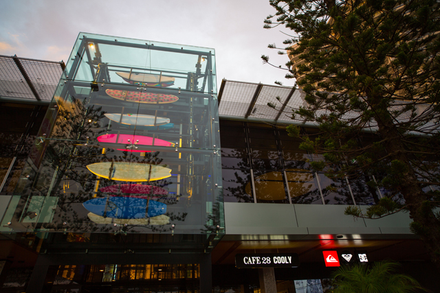 Dotato di tre ingressi distinti, il Boardriders di Coolangatta è stato pensato per ospitare due caroselli in grado di contenere 500 tavole, tutte in vendita. Il primo scorre dall’alto al basso sulla facciata principale del negozio, mentre il secondo è all’interno e scorre lungo il soffitto. Inoltre l’artista Wade Lewis ha riprodotto una foto della leggendaria Snapper Rocks su uno dei muri del Boardriders.