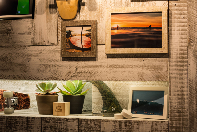 Il legno naturale abbellisce lo spazio dedicato alle collezioni Quiksilver (composta da beachwear, da una linea d’abbigliamento e da una gamma più tecnica dedicata al surf) e Roxy (composta da capi fashion per la spiaggia, dalla linea PopSurf e quella per il Fitness) facendo in questo modo da cornice alla loro esposizione.