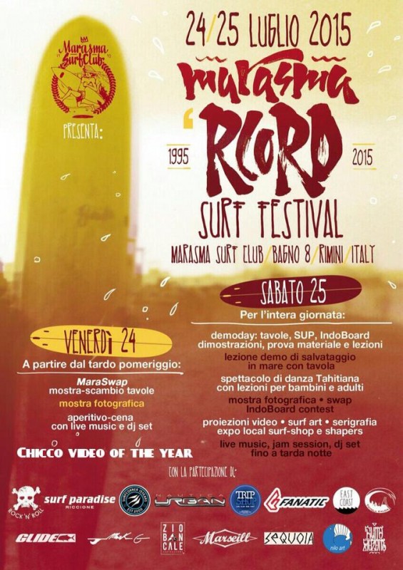 In occasione dei primi vent’anni di attività, il Marasma Surf Club di Rimini, uno dei più longevi della costa adriatica, festeggia con un Surf Festival di due giorni, il 24 e 25 Luglio 2015, due giorni di festa, musica, demo, esposizioni di tavole surf e skate, proiezioni video, surf swap e molto molto altro… naturalmente siete tutti invitati!