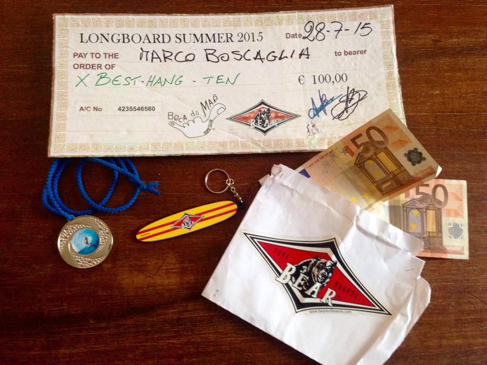 Vincono un soggiorno di una settimana a Fuerteventura offerto dalla Mosquito Surf in collaborazione con la Rezon Surf House, sempre di Fuerte, Valentina Vitale e Federico Nesti, il quale si aggiudica pure una splendida Surf Board Bear 9.0 che verrà spedita direttamente a casa sua da Bear in persona ! Ancora premi, coppe, medaglie e cappelli Bear per tutti i finalisti ed in ultimo ma non infine un assegno di 100,00 euro per Valentina Vitale come migliore donna e altri 100,00 euro a Marco Boscaglia per il miglior Best Hang-Ten della giornata.