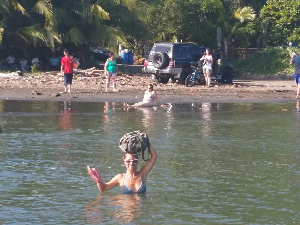 Il mio ragazzo Andrea prepara subito la tavola e io mi metto il costume; per arrivare a Playa Estero dobbiamo guadare un piccolo fiume, in questo momento c’è bassa marea, l’acqua mi arriva quindi alle caviglie ma mi ritroverò nei prossimi giorni con l’acqua alla gola!