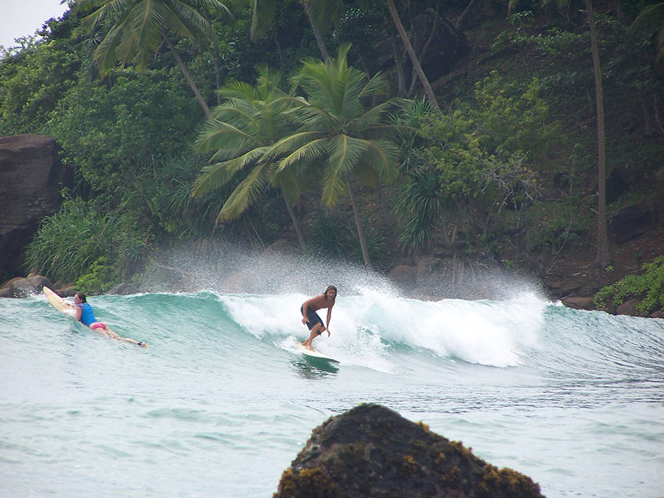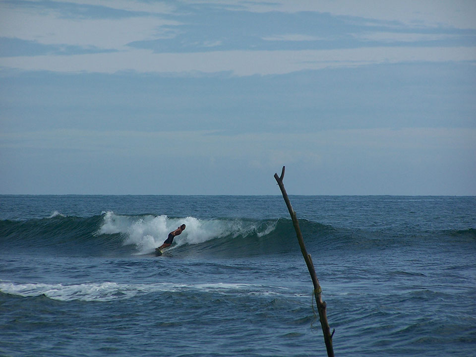 Il giorno successivo, mi sono svegliato all’alba col rumore delle onde e ho surfato tutta la mattina davanti a casa; corse lunghe sul long, assenza di vento e poca gente in acqua. Nel pomeriggio decidiamo di andare a vedere un altro spot, così contrattiamo con un taxista di tuc tuc per arrivare a Madia. Stradine sterrate nella giungla sembrano non finire mai; quando si inizia a intravedere l’oceano vedo che ci sono 3 picchi deserti con onde destre e sinistre alte un metro e mezzo o due metri. Perfette! Lo spot era deserto e chiedo quindi al taxista se era possibile surfare qui: forse il posto era pericoloso per il fondale o per la presenza di coccodrilli avvistati qualche giorno prima nella vicina Matara, ma secondo lui non c’erano problemi. Mi sono buttato quindi subito in acqua, era calda e pulita.