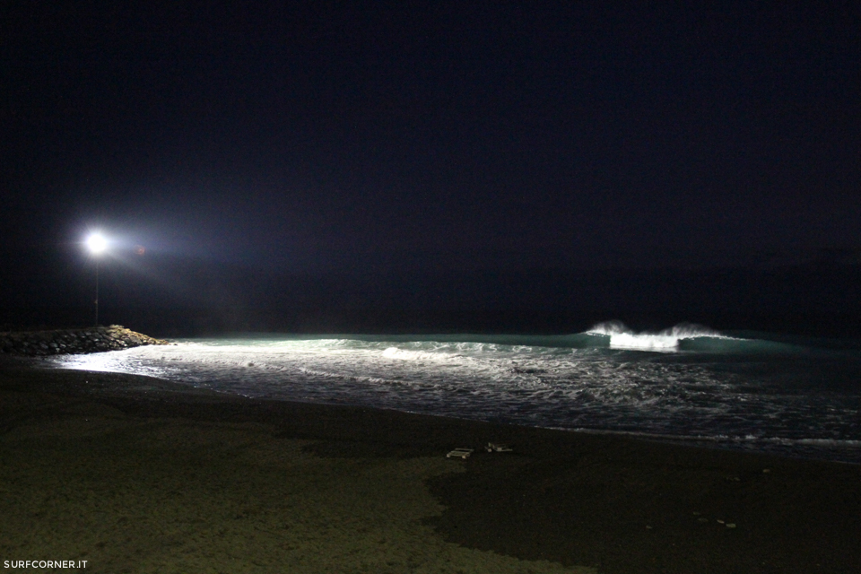 La settimana scorsa abbiamo approfittato di una mareggiata in Liguria per andare a Varazze a provare di persona il surf di notte sotto la luce dell’ormai famoso faro che illumina il main spot della cittadina ligure. Al mattino il mare era ancora un pò ingolfato e rovinato dal vento da sud est, poi nel pomeriggio ha cominciato a regolarizzarsi e lisciarsi, ma a un certo punto, proprio sul più bello, era già buio! Troppo presto per rinunciare alle onde che stavano diventando sempre più perfette. Il faro di Varazze, posizionato sul moletto di fronte alla Secca, si è rivelato una manna dal cielo e per le successive due ore abbiamo potuto continuare a surfare onde di 1/1,5 mt. assolutamente perfette e senza quasi nessuno in acqua. Oltre a noi due della redazione c’erano solo altri tre surfisti nel momento di affollamento massimo.