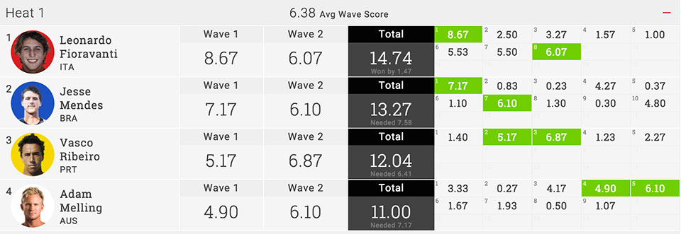 Per tutta la durata della heat le carte in tavola si sono mescolate ripetutamente, con Leo che passava dal primo al quarto posto, poi terzo, secondo e di nuovo terzo a pochi minuti dalla fine. Ma Leo è uno di quelli che quando viene messo all’angolo reagisce e da il meglio di sè e così nell’arco degli ultimi tre minuti della heat ha sfoderato la sua doppia coppia di off the lip e spinnoni riconquistando il primo posto davanti a Jesse Mendes per approdare al quarto round.
