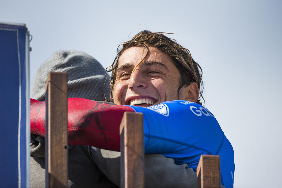 Leonardo abbraccia il suo team manager Steven Belly al settimo cielo per la nuova storica vittoria. Foto WSL/Cestari