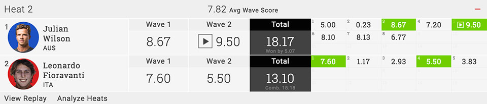 QF 2: Julian Wilson (AUS) 18.17 def. Leonardo Fioravanti (ITA) 13.10