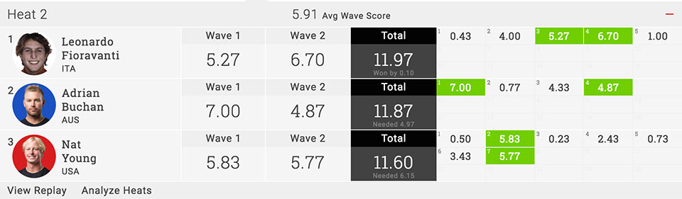 Heat 2: Leonardo Fioravanti (ITA) 11.97, Adrian Buchan (AUS) 11.87, Nat Young (USA) 11.60