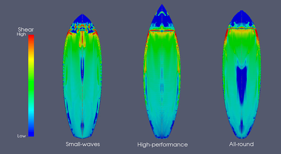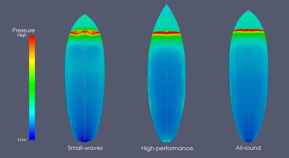 Detto in parole semplici, la termofluidodinamica applicata alle tavole da surf, permette di studiare le linee migliori attraverso lo studio “a monte” del comportamento dell’acqua lungo le linee della tavola, potendo concentrarsi anche su singole zone d’interesse come nose, bordi, poppa ecc.