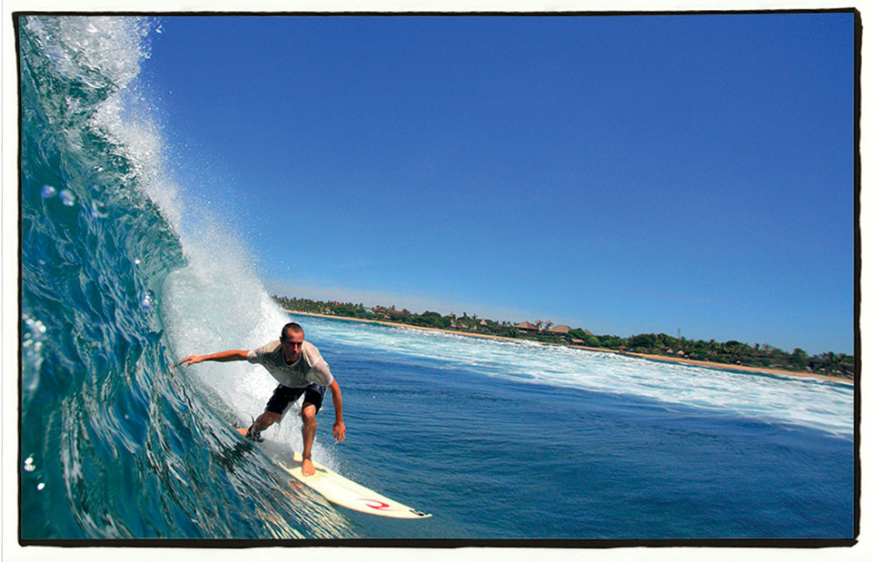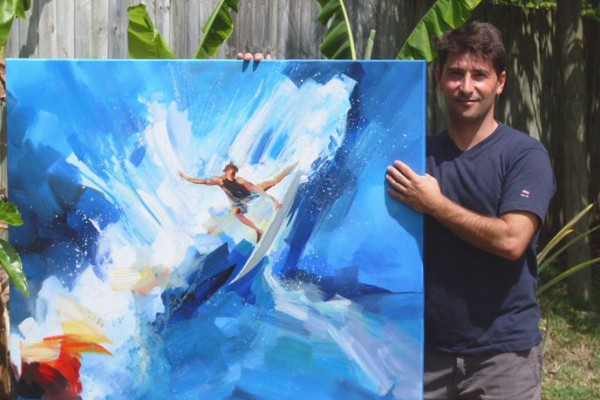 Vincenzo Ganadu con una delle sue innumerevoli opere a tema surf.