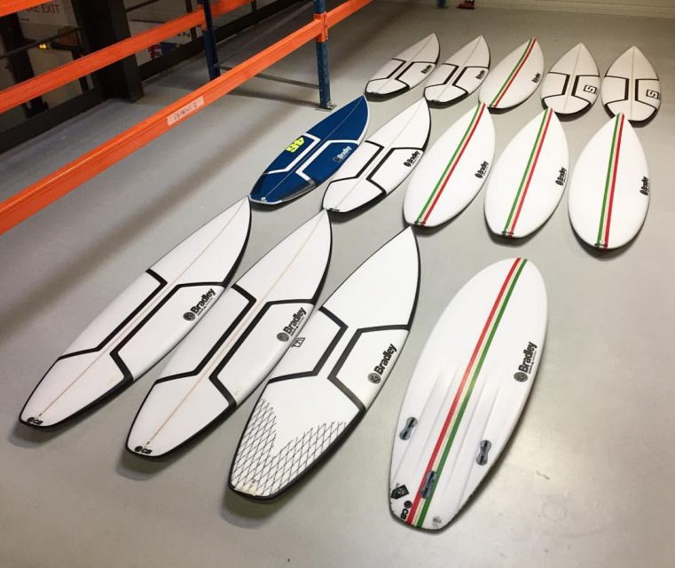 La maggior parte del quiver di Leo si compone di modelli CB1 che sono le tavole più performanti del quiver. Ci sono cinque CB1 con misure 5’11 (anche 5’11 1/2) x 18 5/8 x 2 5/16. Queste sono le copie delle tavole che Leo aveva l’anno scorso all’inizio della stagione e con cui ha guadagnato i primi buoni risultati. Leo le usa per gli eventi WQS e possibilmente per Bells Beach o per il Western Australia in caso di onde non grosse. Per Margaret River ci sono 8 tavole extra con misure da 6’0, 6’1, 6’2, 6’3, 6’4. Tutte 18 5/8 x 2 5/16 e le più grandi 2 3/8.