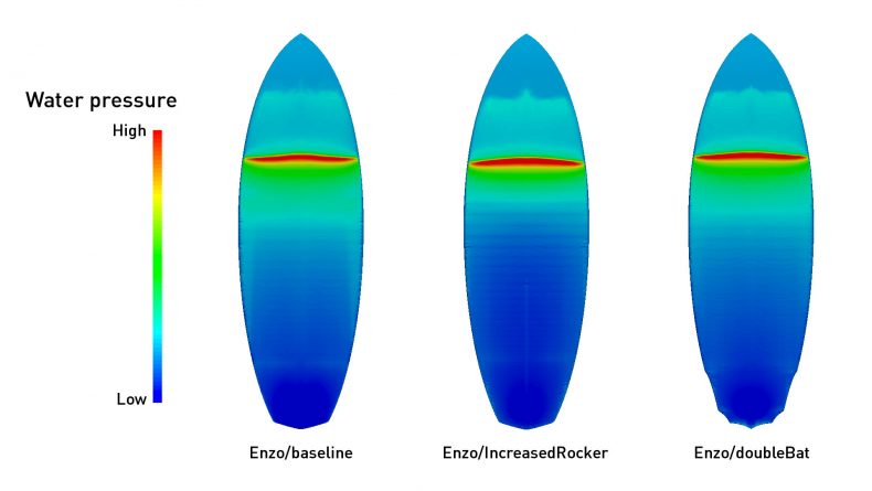 Grazie alla CFD, la profondità del “single concave” nella Sfan Enzo è stato ottimizzato per incrementare la pressione dell’acqua sotto la tavola e il derivante aumento della spinta dinamica per compensare l’utilizzo di un “rocker” più aggressivo che dona alla tavola la capacità di girare più velocemente e con angoli più stretti “fit in the pocket”!