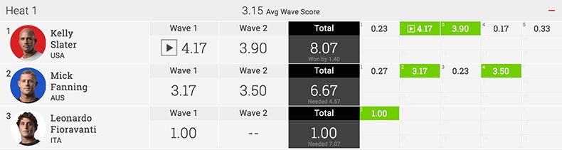 Purtroppo per Leo le onde nella prima heat sono arrivate col contagocce, tanto che fino alla prima metà della heat non è successo praticamente nulla. Ne ha approfittato Slater che con due onde da 4.17 e 3.90 si è preso la rivincita contro Leonardo, che l’anno scorso l’aveva battuto a Margaret.