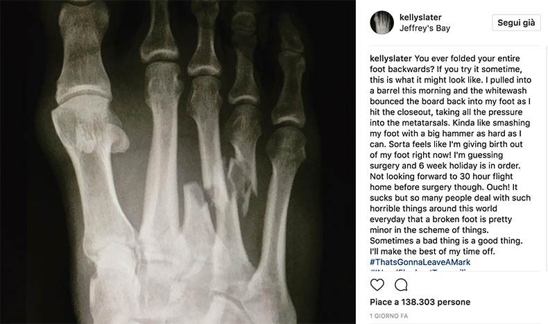 L’11 volte campione del mondo si è rotto due ossa metatarsali del piede destro durante la session di freesurf di lunedì mattina ed è stato costretto ad abbandonare la competizione, dove lo aspettava il terzo round. Mentre stava surfando, è entrato dentro un tubo che si è rivelato un close out e mentre era sott’acqua la tavola gli è tornata indietro con forza come una martellata rompendogli le due ossa del piede.