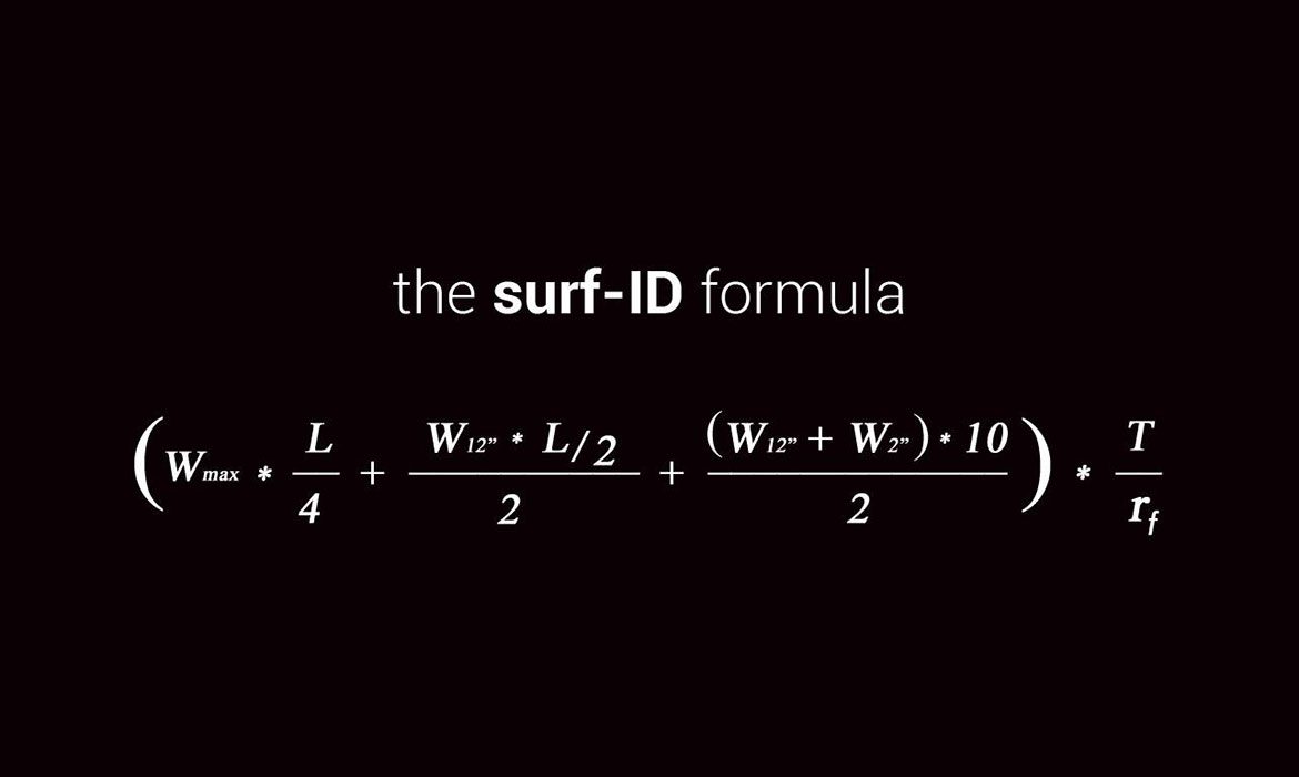 Attraverso alcune semplici dimensioni che qualsiasi shaper o surfer può misurare, l’equazione Surf-ID calcola un’area di planata dinamica corretta da un fattore adimensionale che considera anche lo spessore massimo e la forma del rail. Il numero risultante offre una migliore comprensione del potenziale e della personalità della tavola da surf.