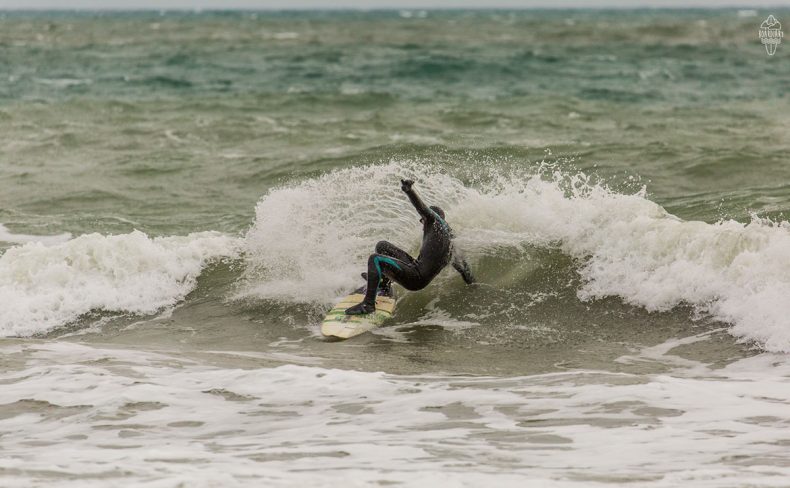 Calzari, muta, guanti e cappuccio, qualche minuto e siamo già in line-up, condivisa con un paio di kiters locali. E’ proprio vero che una volta in acqua la misura è maggiore di quella percepita da fuori, infatti la tavoletta non fatica troppo a partire sul metro scarso, anche se per le sezioni choppy un bel biscotto non avrebbe fatto male.