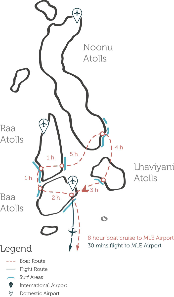 Controlla la mappa generale in fondo all’articolo per una configurazione geografica globale di tutti gli atolli maldiviani, i loro aeroporti nazionali e internazionali più importanti e le loro migliori regioni per il surf. Una volta che avrai un’idea di base su quale potrebbe essere l’Atollo giusto, consulta le mappe specifiche per singolo Atollo. Queste forniscono approfondimenti molto più dettagliati come rotte, orari di crociera, località aeroportuali e una descrizione approfondita dei pro e contro dell’atollo in questione.