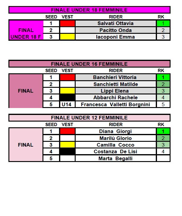 Nell’Under 14, dopo il recupero dall’infortunio ed un non fortunato esordio di stagione, torna al successo Brando Giovannoni, seguito da Valerio Funari, Rufo Massimo Baita e Diego Giorgi.