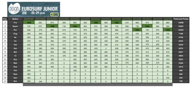 Noah Eurosurf Junior 2018 termina così con la squadra francese al primo posto, con 10.496 punti, la Spagna al secondo con 10.281 punti, e il Portogallo al terzo con 10.203 punti.